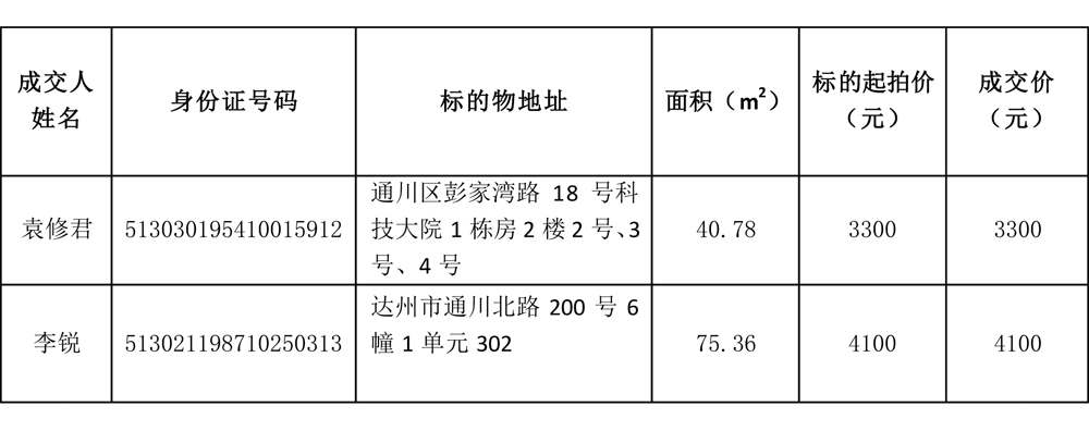 按照市國資委《關(guān)于印發(fā)達(dá)州市屬國有企業(yè)資產(chǎn)出租管理辦法的通知》(達(dá)市國資委發(fā)〔2019〕251號)相關(guān)規(guī)定,達(dá)州市投資有限公司于2023年11月3日以現(xiàn)場競價方式在達(dá)州市投資有限公司5樓會議室對參與報名的2宗國有資產(chǎn)進行公開競價,現(xiàn)將成交結(jié)果公示如下: